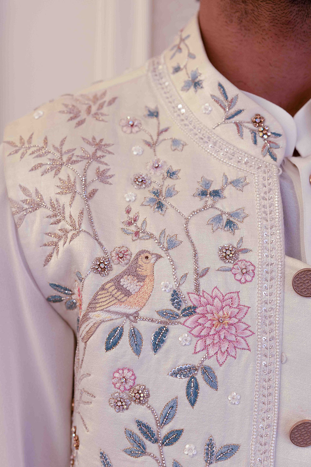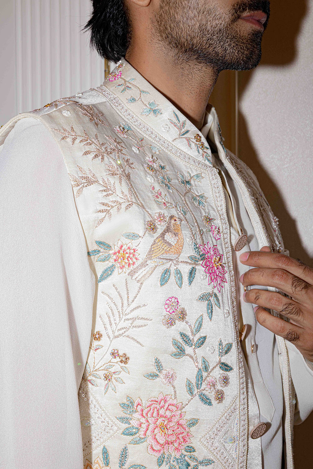 Ivory Silk Georgette Fish-Cut Lehenga, Intricately Hand-Embroidered With Chikankari, Resham & Subtle Zari Accent, Paired With A Embroidered Sculpted Winged Corset